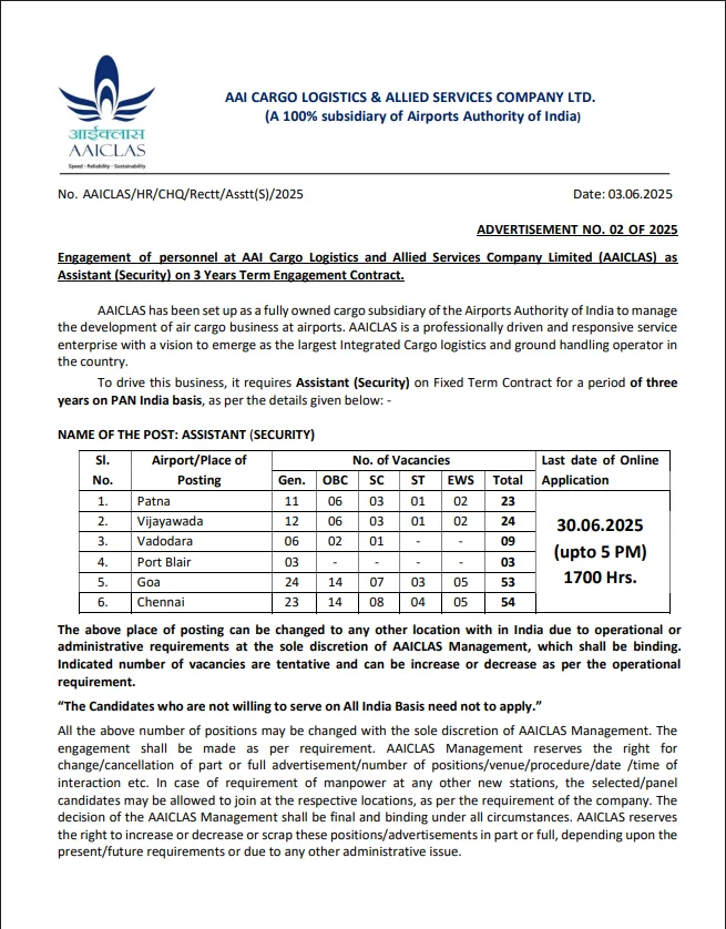तो देर मत कीजिए, 9 जून से Airport Authority of India Assistant Security Recruitment 2025 आवेदन प्रक्रिया शुरू हो रही है – तैयार रहें, दस्तावेज़ तैयार रखें और समय पर आवेदन करें।